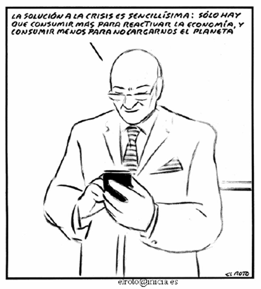 Los ciudadanos y ciudadanas europeos, en su gran mayoría, asumen la idea de que la sociedad de consumo actual puede “mejorar” hacia el futuro (y que debería hacerlo). Mientras tanto, buena parte de los habitantes del planeta esperan ir acercándose a nuestros niveles de bienestar material. Sin embargo, el nivel de producción y consumo se ha conseguido a costa de agotar los recursos naturales y energéticos, y romper los equilibrios ecológicos de la Tierra.