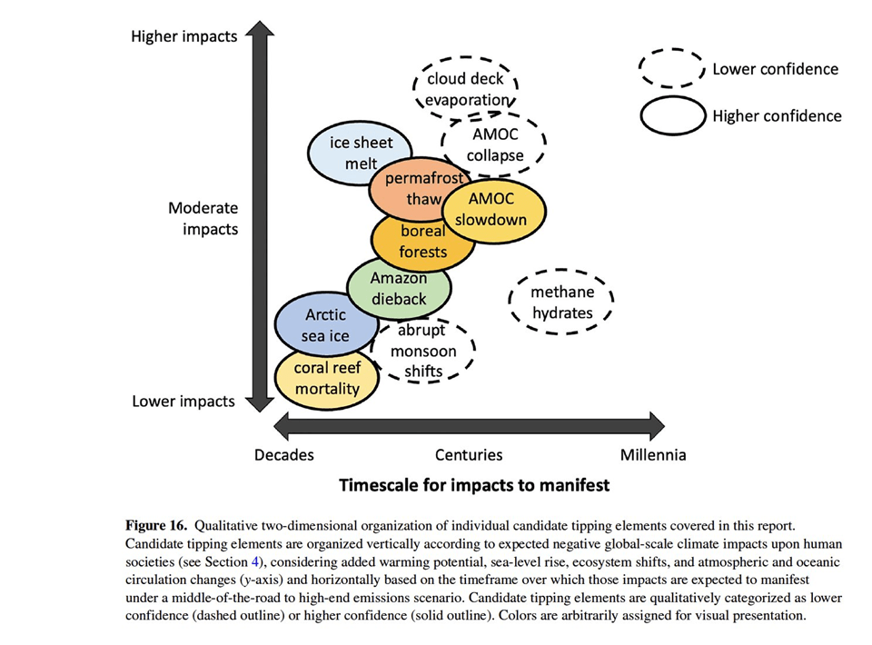 A falta de un metaestudio a la escala que solo el IPCC puede hacer, Seaver Wang y su equipo ha publicado recientemente una exhaustiva revisión de la literatura científica sobre la aproximación a umbrales críticos de diez puntos de inflexión climática[24], clasificándolos en función de sus impactos (altos o bajos), su escala temporal de afección (décadas, siglos, milenios) y el grado de confianza científica de las proyecciones barajadas.